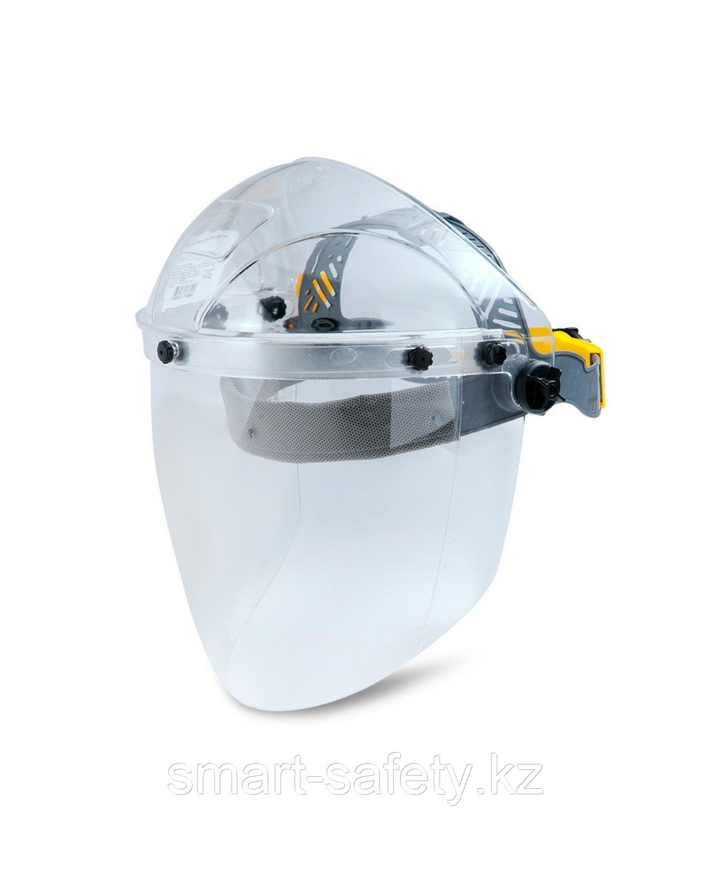 Прозрачный увеличенный козырёк оснащён специальной площадкой для нанесения логотипа. Размер экрана — 210×385 мм, крепление — наголовное с удобной системой регулировки RAPID (храповик).
